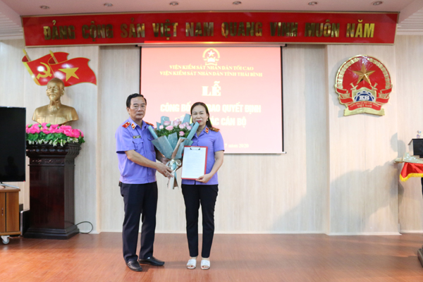 8/3/2020 4:22:41 PMChiều ngày 31/7/2020, lãnh đạo Viện kiểm sát nhân dân tỉnh Thái Bình long trọng tổ chức buổi lễ gặp mặt, chia tay đồng chí Phạm Thị Thùy - Kiểm sát viên trung cấp, Trưởng phòng Tổ chức cán bộ Viện kiểm sát nhân dân tỉnh nghỉ chế độ hưu trí từ ngày 01/8/2020; đồng thời công bố và trao quyết định bổ nhiệm cán bộ giữ chức vụ Trưởng phòng Tổ chức cán bộ Viện kiểm sát nhân dân tỉnh.