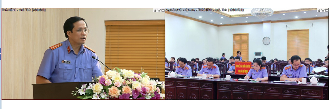 6/21/2023 2:51:52 PMSáng ngày 21/6/2023, Viện kiểm sát nhân dân tỉnh Thái Bình tổ chức hội nghị kiểm điểm, đánh giá kết quả công tác đã đạt được trong quá trình triển khai thực hiện kế hoạch công tác của các đơn vị, những hạn chế, tồn tại trong việc thực hiện nhiệm vụ và chỉ tiêu công tác trong 6 tháng đầu năm 2023. Đồng thời đề ra giải pháp, nhiệm vụ trọng tâm thực hiện trong 6 tháng cuối năm 2023. Hội nghị được tổ chức bằng hình thức trực tuyến, kết nối với 8 điểm cầu Viện kiểm sát cấp huyện dưới sự chủ trì của các đồng chí lãnh đạo Viện kiểm sát nhân dân tỉnh. Tham dự hội nghị tại điểm cầu chính còn có các đồng chí lãnh đạo Viện kiểm sát nhân dân tỉnh, lãnh đạo và Kiểm sát viên trung cấp các phòng trực thuộc Viện kiểm sát nhân dân tỉnh.
