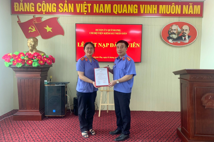 4/4/2024 1:13:01 PMSáng ngày 03/4/2024, chi bộ Viện Kiểm sát nhân dân huyện Quỳnh Phụ long trọng tổ chức buổi Lễ kết nạp Đảng viên mới cho đoàn viên ưu tú Vũ Quỳnh Lam. Tham dự buổi lễ có Ban chi ủy cùng toàn thể các đồng chí đảng viên trong chi bộ.