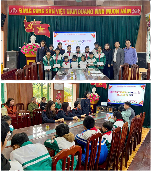 1/23/2025 1:08:28 PMVới tinh thần tương thân tương ái, lá lành đùm lá rách, chia sẻ khó khăn với học sinh nghèo, vượt khó, ngày 23/01/2025 Lãnh đạo Viện kiểm sát nhân dân huyện Kiến Xương cùng Chi đoàn thanh niên Viện kiểm sát nhân dân huyện Kiến Xương đã đến thăm, tặng quà cho các em học sinh có hoàn cảnh khó khăn tại trường Tiểu học và Trung học cơ sở xã An Bình, huyện Kiến Xương nhân dịp Tết Nguyên đán Ất Tỵ 2025